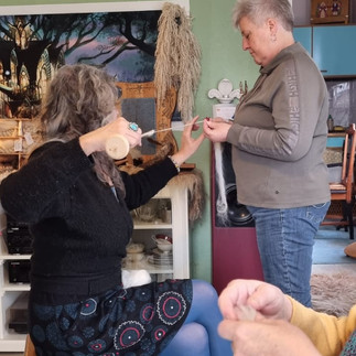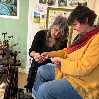 Doch glaubt mir, was wir hier alles lernen durften, das hätte viele Tage füllen können. Schafs-Lehre, Schafswolle-Lehre, Behandlung der Wolle, Unterschiede zwischen den Schafen und ihrer Wolle, Hundewolle, Pflanzenfasern … Danach ging es zur Theorie der Spinnräder. Wir saßen Probe an vielen verschiedenen Rädern.